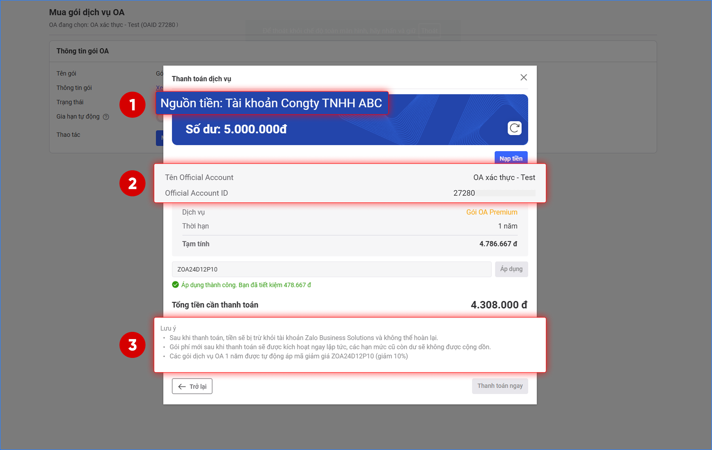→ Chọn Thanh toán ngay. Khi nhấn, admin OA xác nhận rằng:
