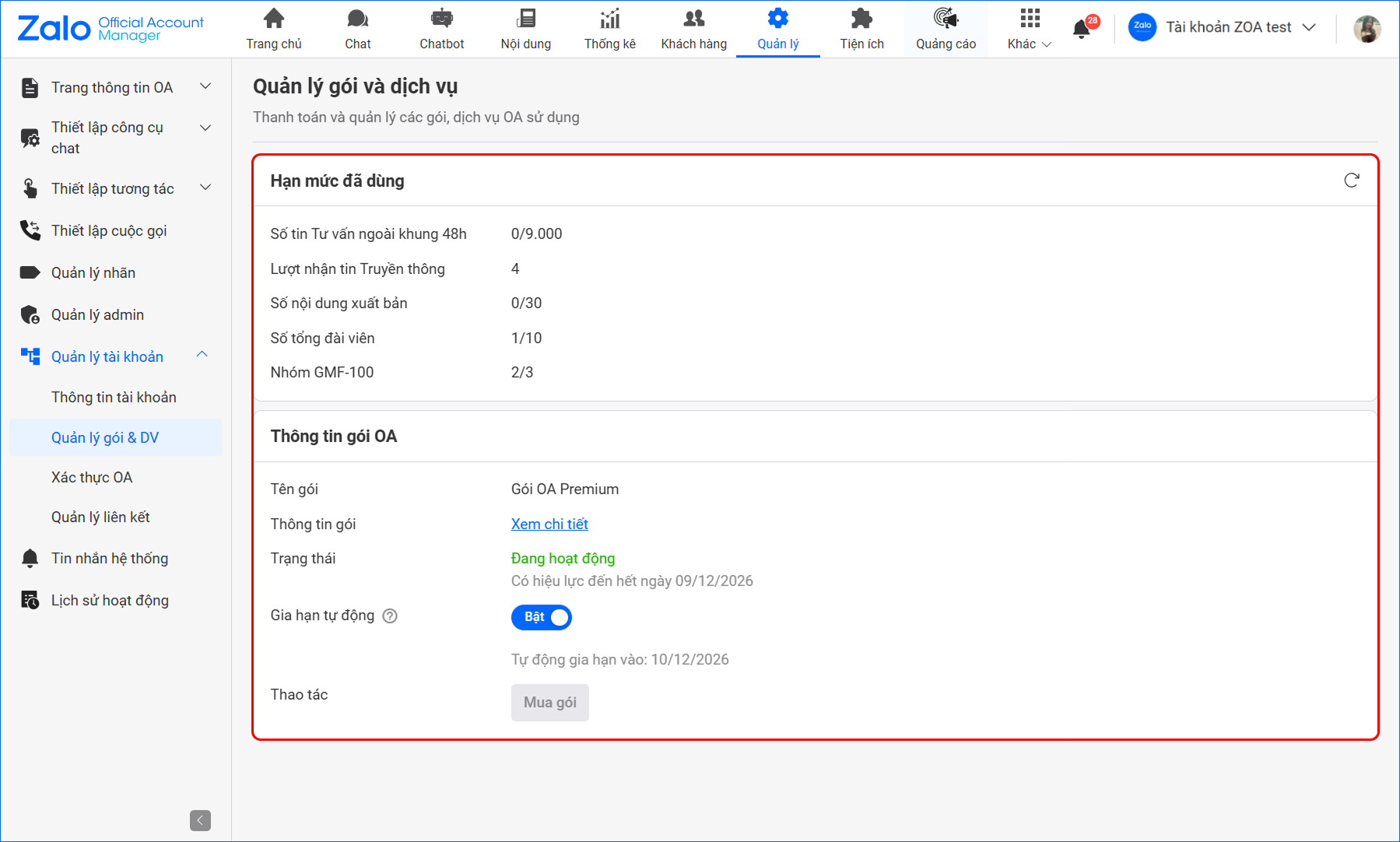 Tài khoản OA xác thực sau khi mua gói thành công có thể thực hiện các thao tác lựa chọn gia hạn tự động và quản lý gói đang sở hữu tại trang Quản lý OA.