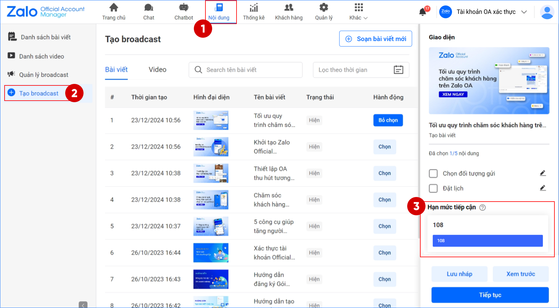 Bước 1: Truy cập mục Nội dung ➞ Tạo broadcast hoặc truy cập đường dẫn https://oa.zalo.me/manage/broadcast/setup