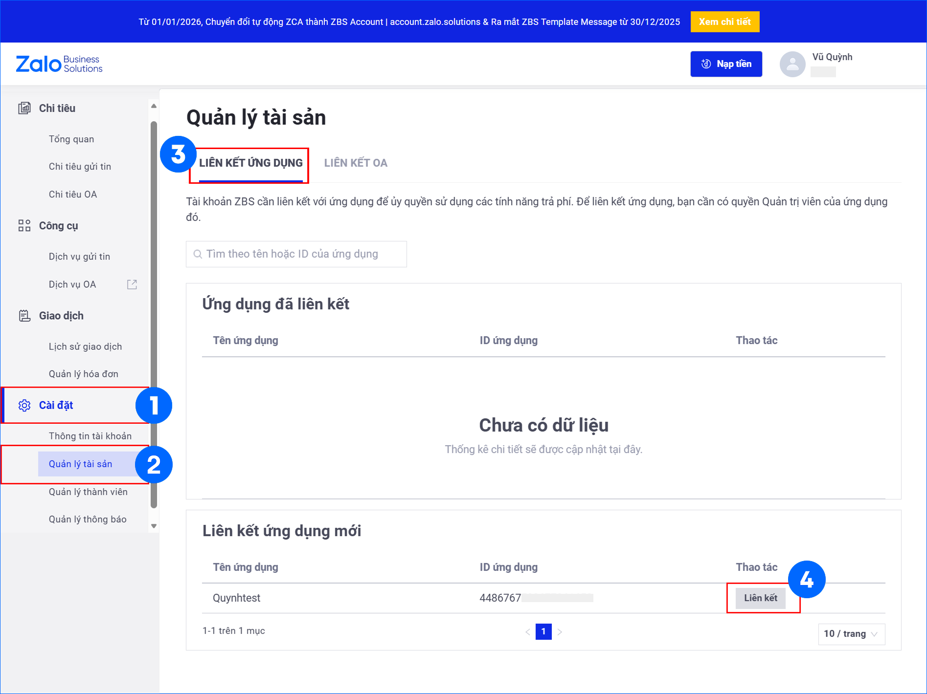 Hướng dẫn liên kết ứng dụng (App ID) vào ZBS Account