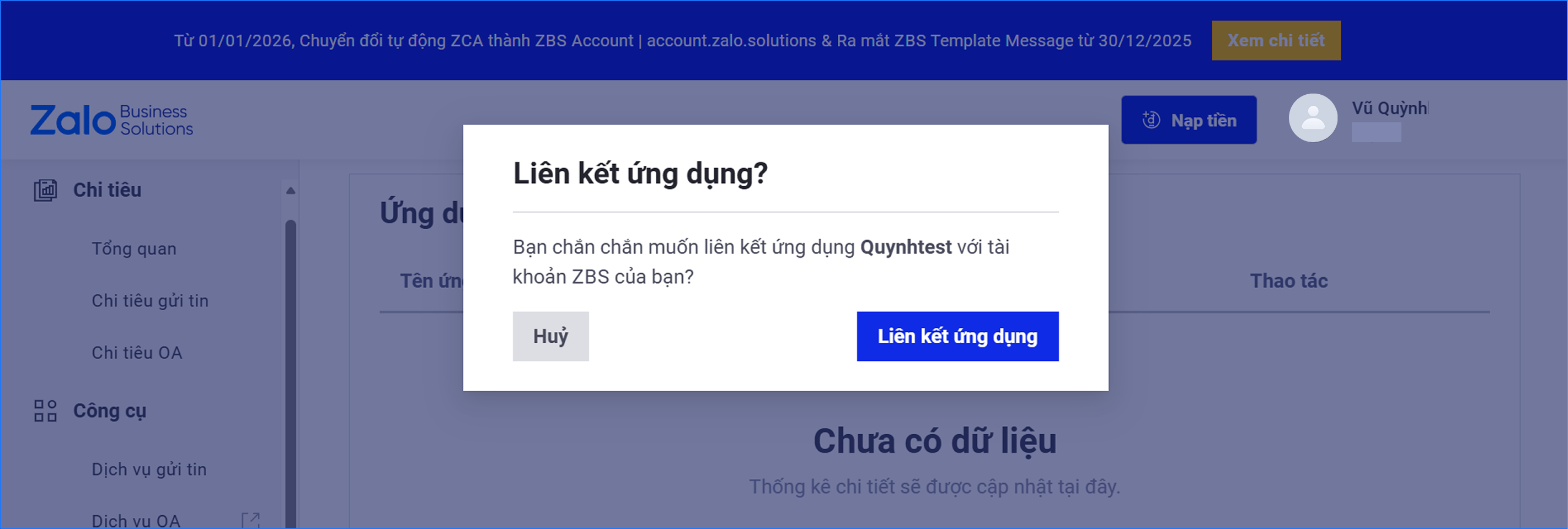 • Để có thể liên kết, anh/chị cần phải là Quản trị viên/Quản trị viên cao cấp của ZBS Account và là Quản trị viên của ứng dụng.