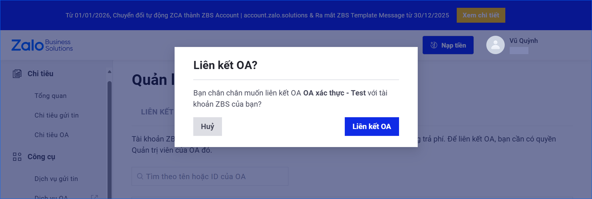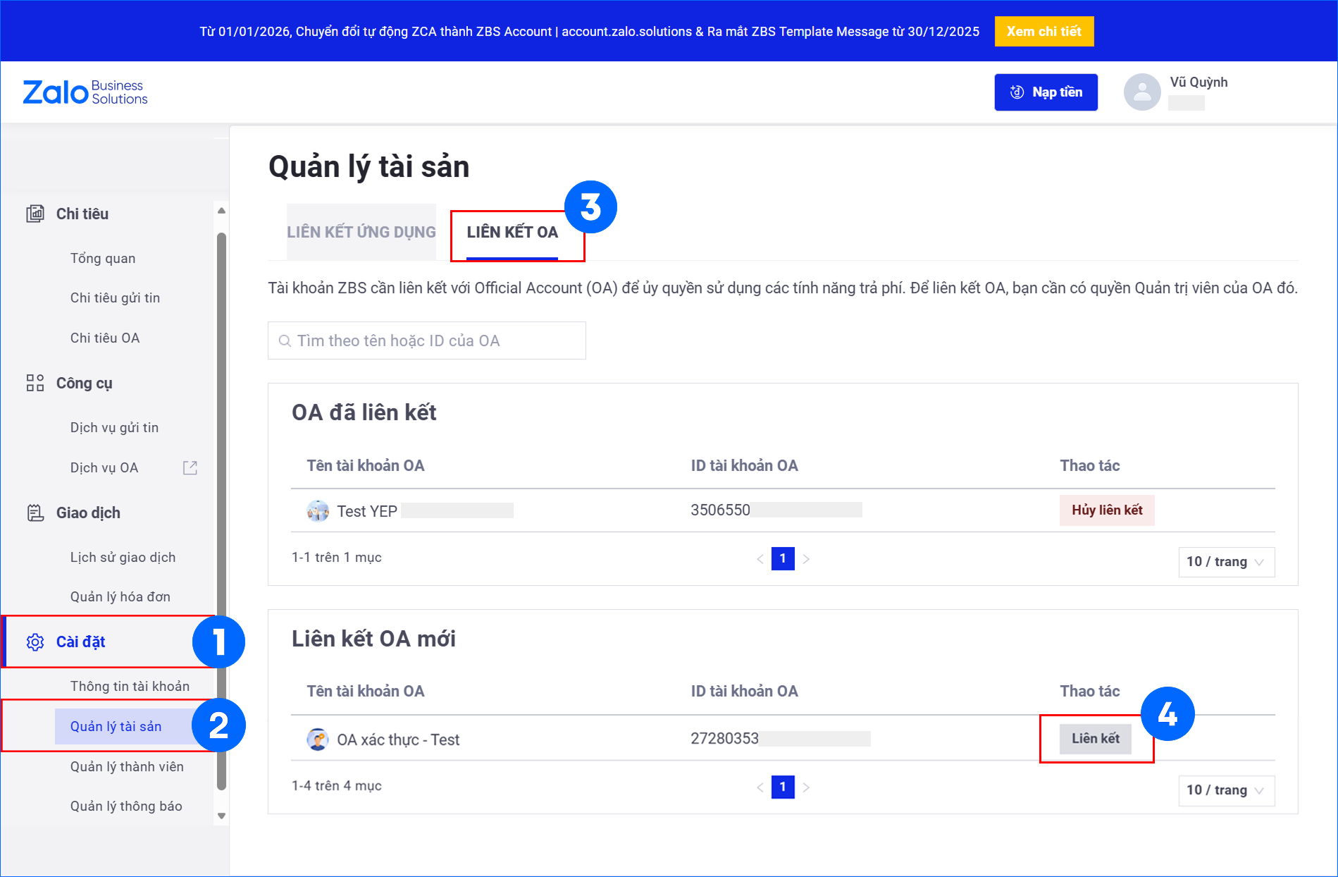 ⚠️ Lưu ý: Chỉ OA xác thực mới có thể liên kết vào ZBS Account.