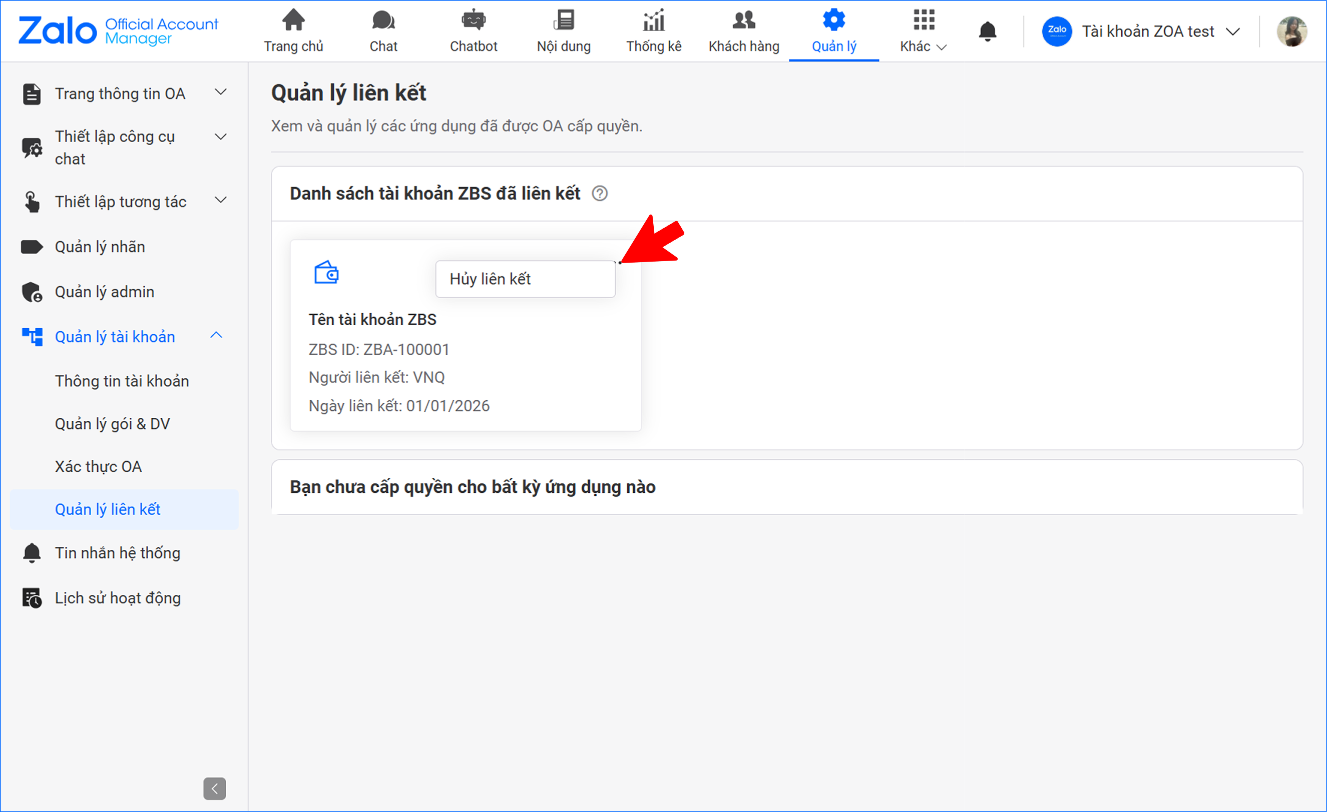 • Tại trang quản lý OA https://oa.zalo.me/manage/oa vào mục Quản lý → Chọn Quản lý tài khoản → Chọn tiếp Quản lý liên kết