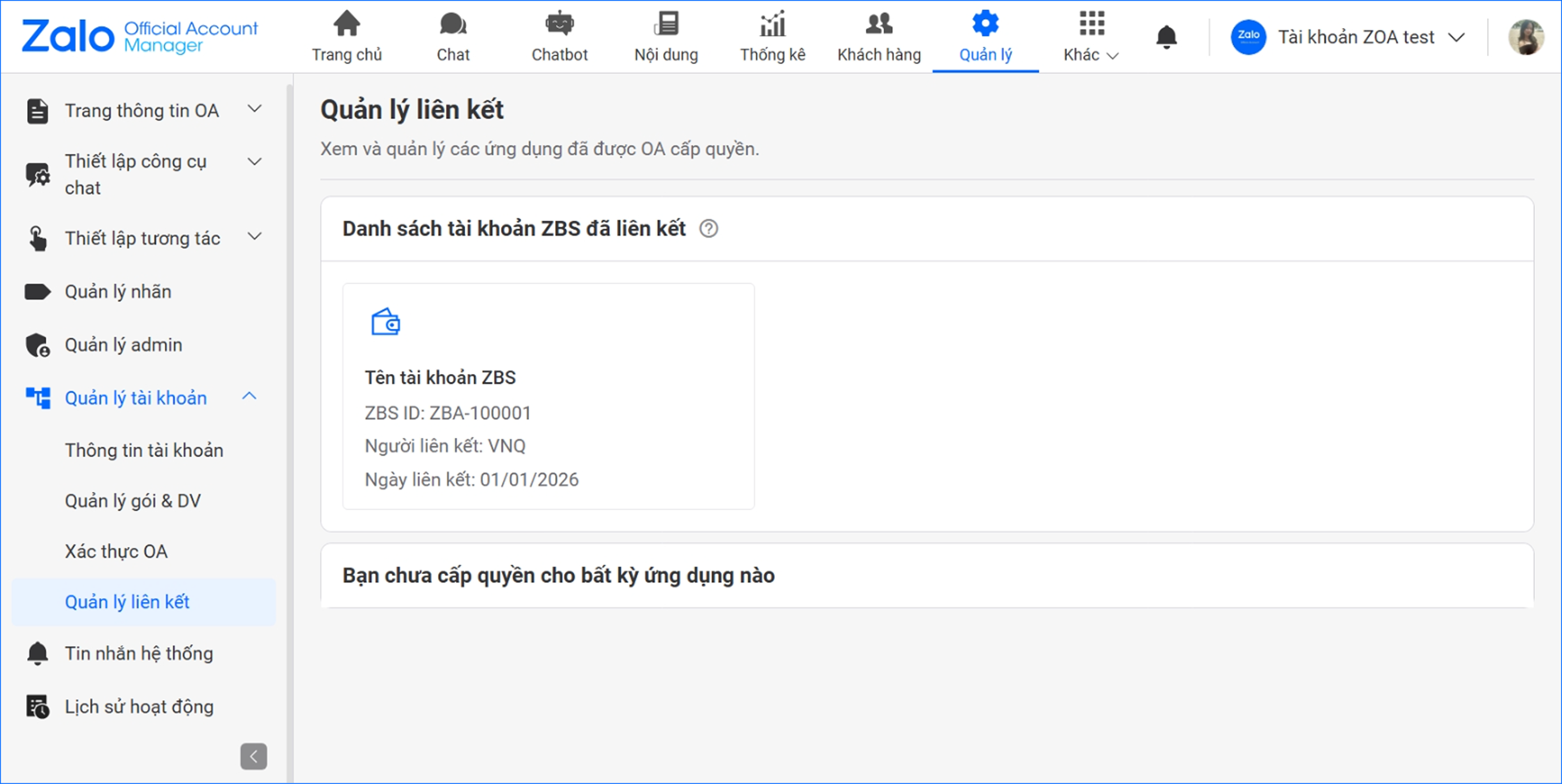 Trang Quản lý liên kết ZBS Account sẽ hiện thông tin tài khoản đã liên kết bao gồm: