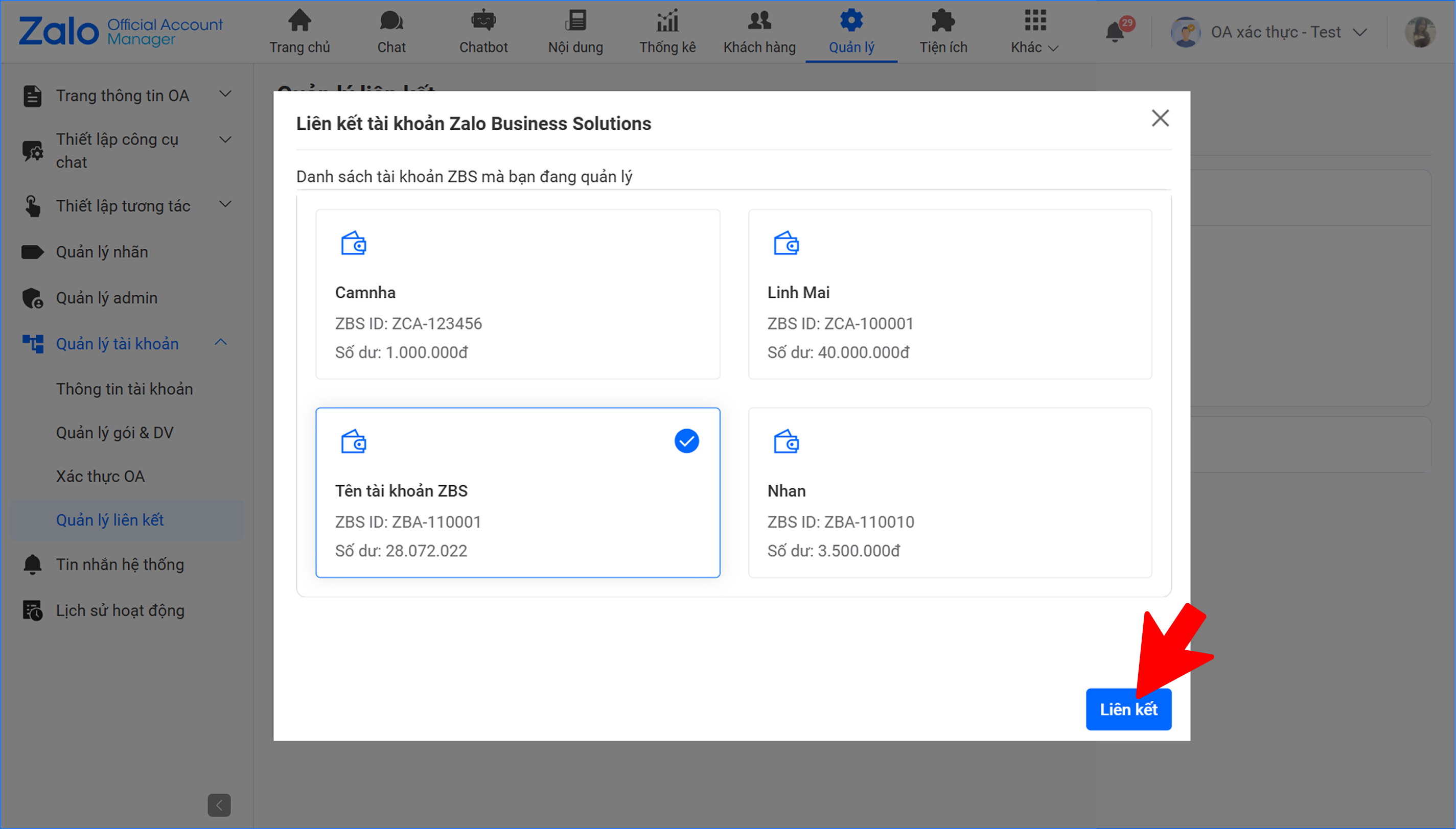 • Người dùng chọn ZBS Account muốn liên kết → Chọn Liên kết → Hệ thống thực hiện liên kết ZBS Account với OA.