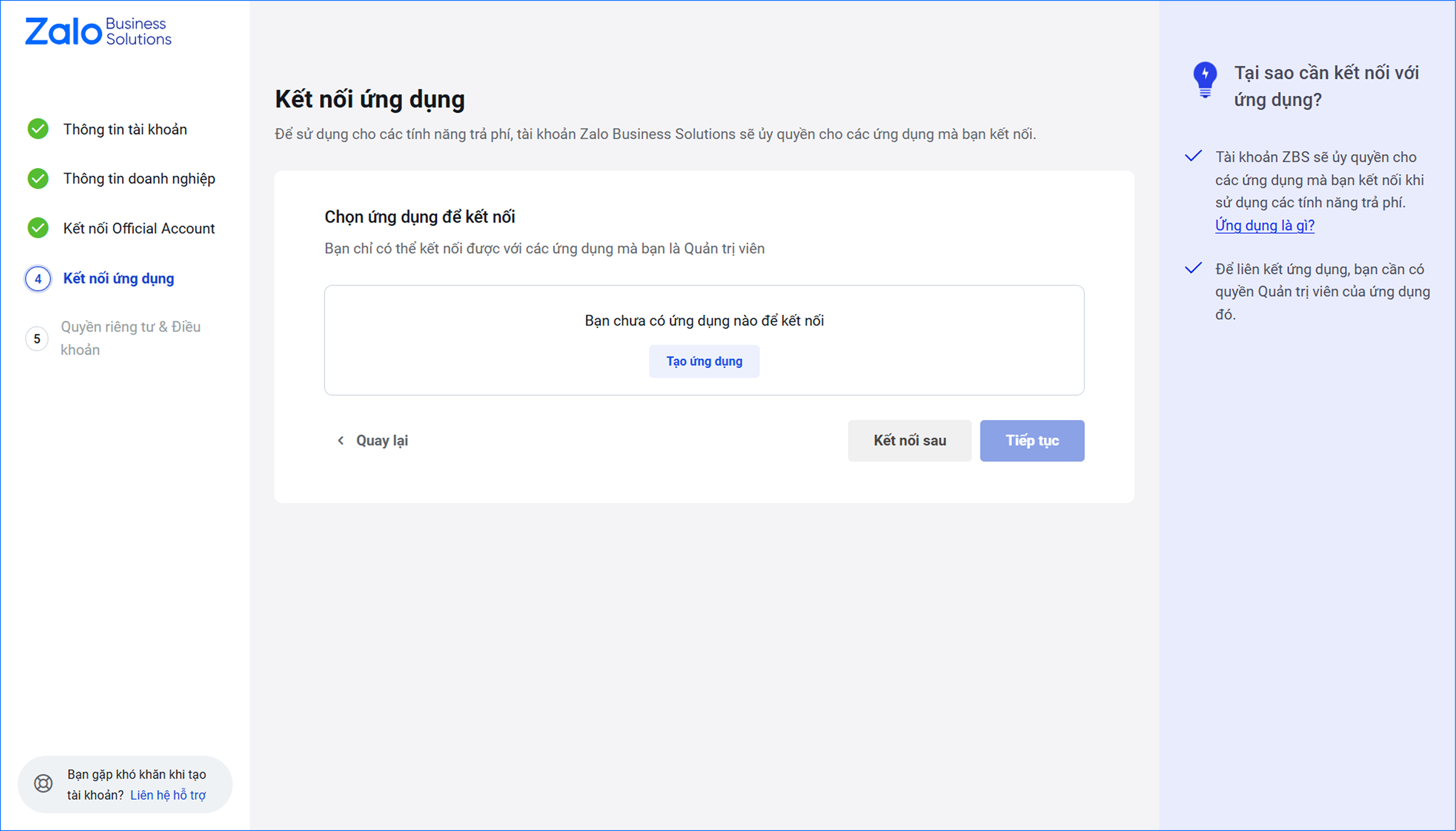 • Trong trường hợp anh/chị chưa có Ứng dụng, chọn Tạo ứng dụng → hệ thống sẽ tạo 1 ứng dụng dưới tên ZBS Account của anh/chị. Anh/chị có thể bỏ qua bằng cách nhấn Tiếp tục nếu không có nhu cầu liên kết ứng dụng.