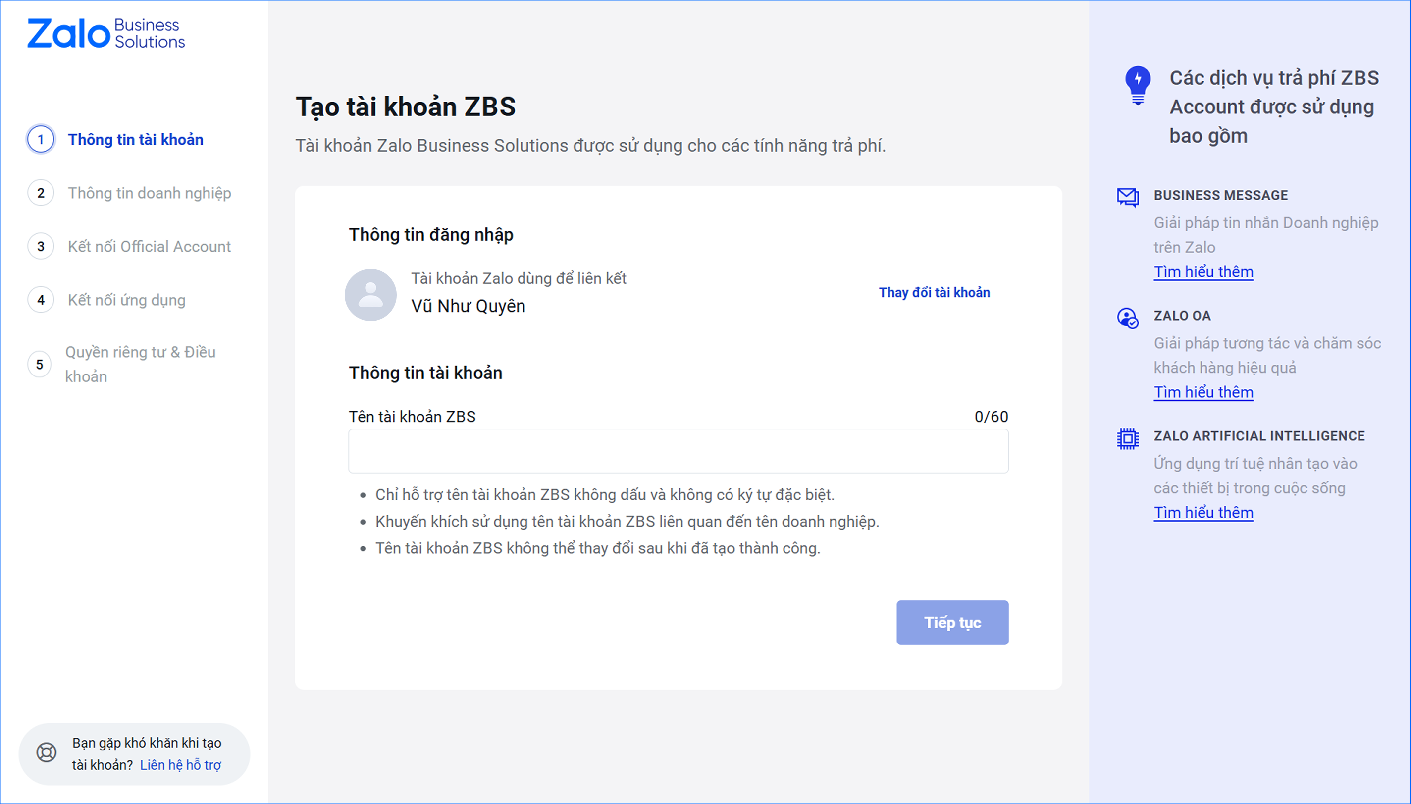 Bước 2: Điền đầy đủ thông tin để tạo ZBS Account