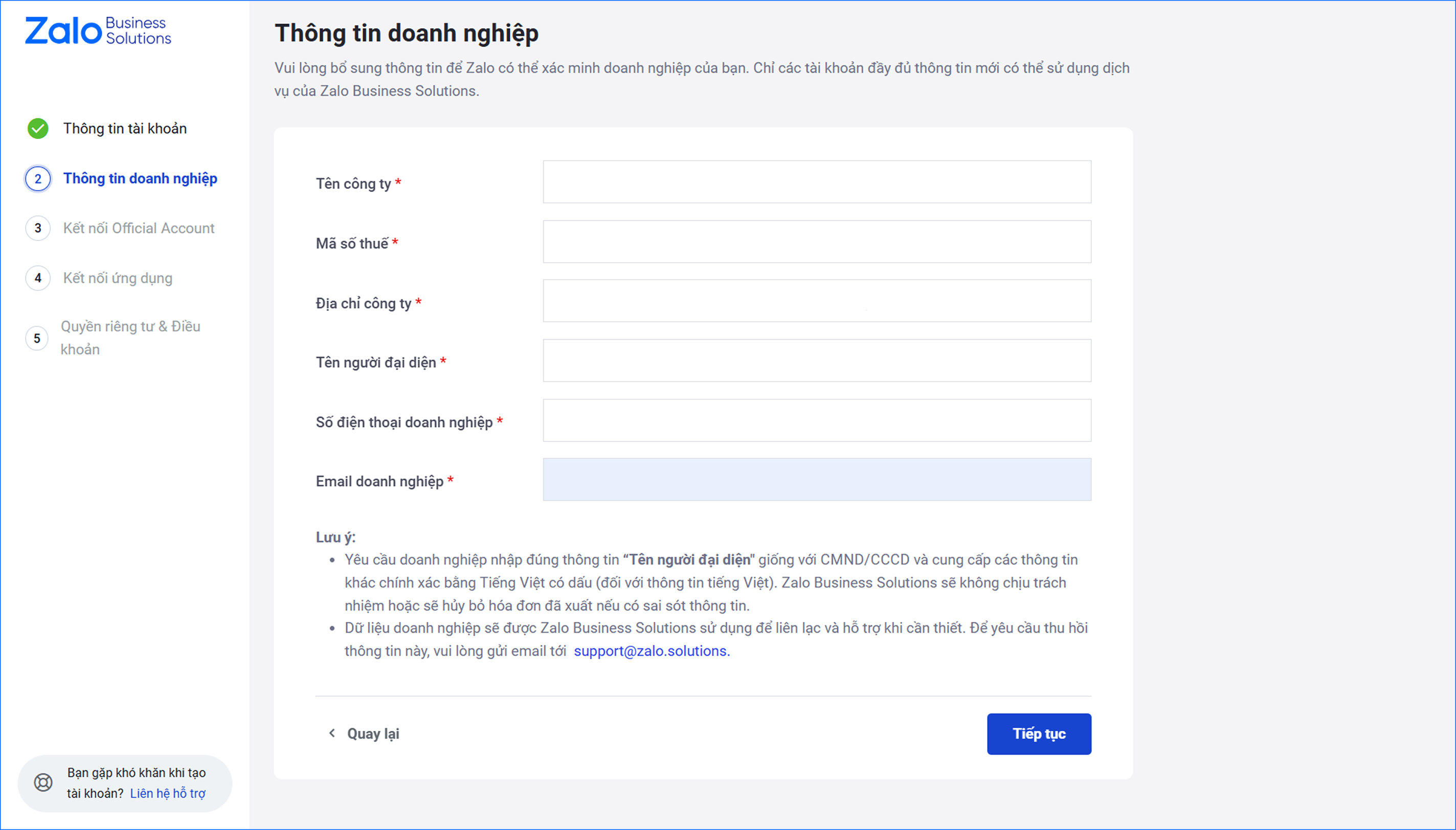 ⚠ Lưu ý: Anh/chị cần điền đầy đủ và chính xác thông tin doanh nghiệp.