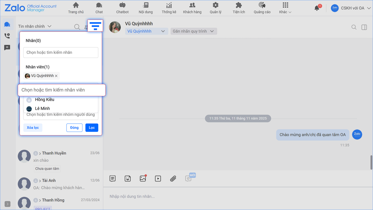 sau đó lọc theo Nhân viên để hiển thị danh sách hội thoại được chỉ định cho nhân viên.