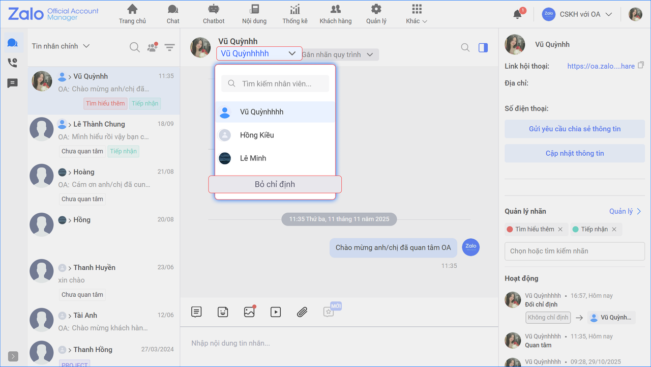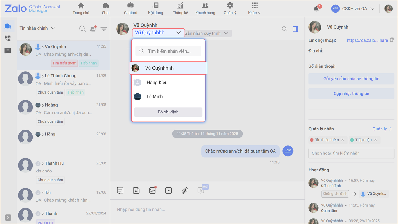 Tại trang màn hình chat: OA chọn Chỉ định nhân viên xử lý để thao tác.