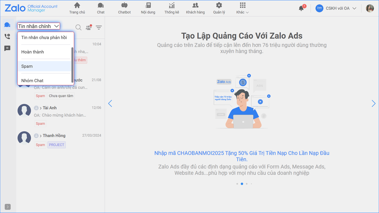 Tại trang màn hình chat: OA chọn “Bộ lọc tin nhắn” chọn “Spam” để tìm thấy danh sách khách hàng được đánh dấu spam.