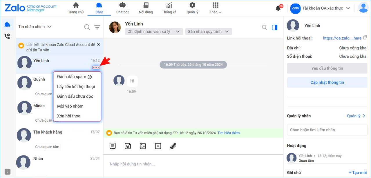 Tính năng đánh dấu spam là tính năng giúp OA phân loại các cuộc hội thoại không cần thiết và ngưng nhận thông báo tin nhắn/cuộc gọi từ phía khách hàng được OA đánh dấu spam.