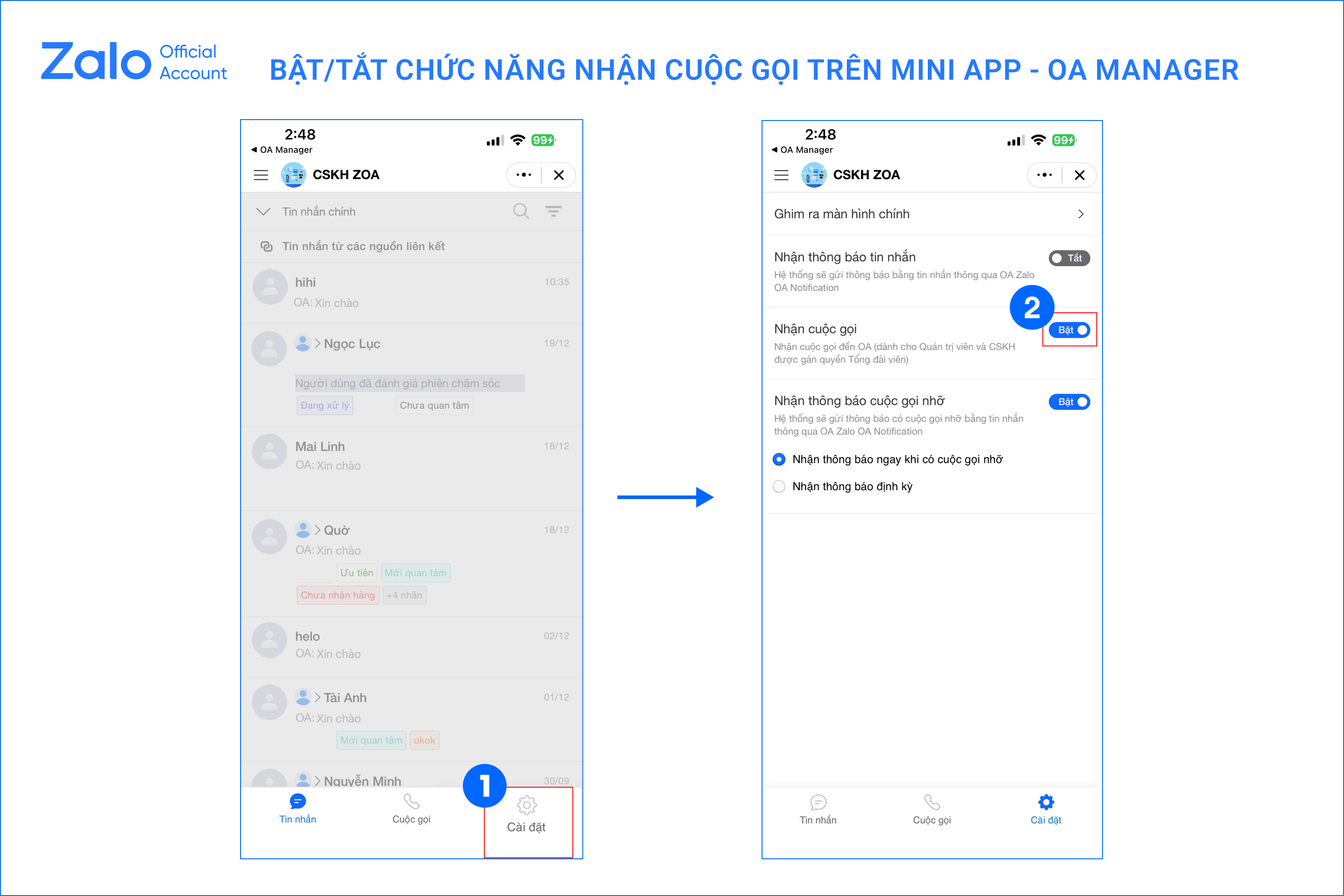Mỗi tổng đài viên có thể chủ động lựa chọn Bật/ Tắt chức năng nhận cuộc gọi trên điện thoại của cá nhân. Cách tiến hành: Vào Mini App - OA manager, chọn mục Cài đặt → chọn Bật/ Tắt nhận cuộc gọi.
