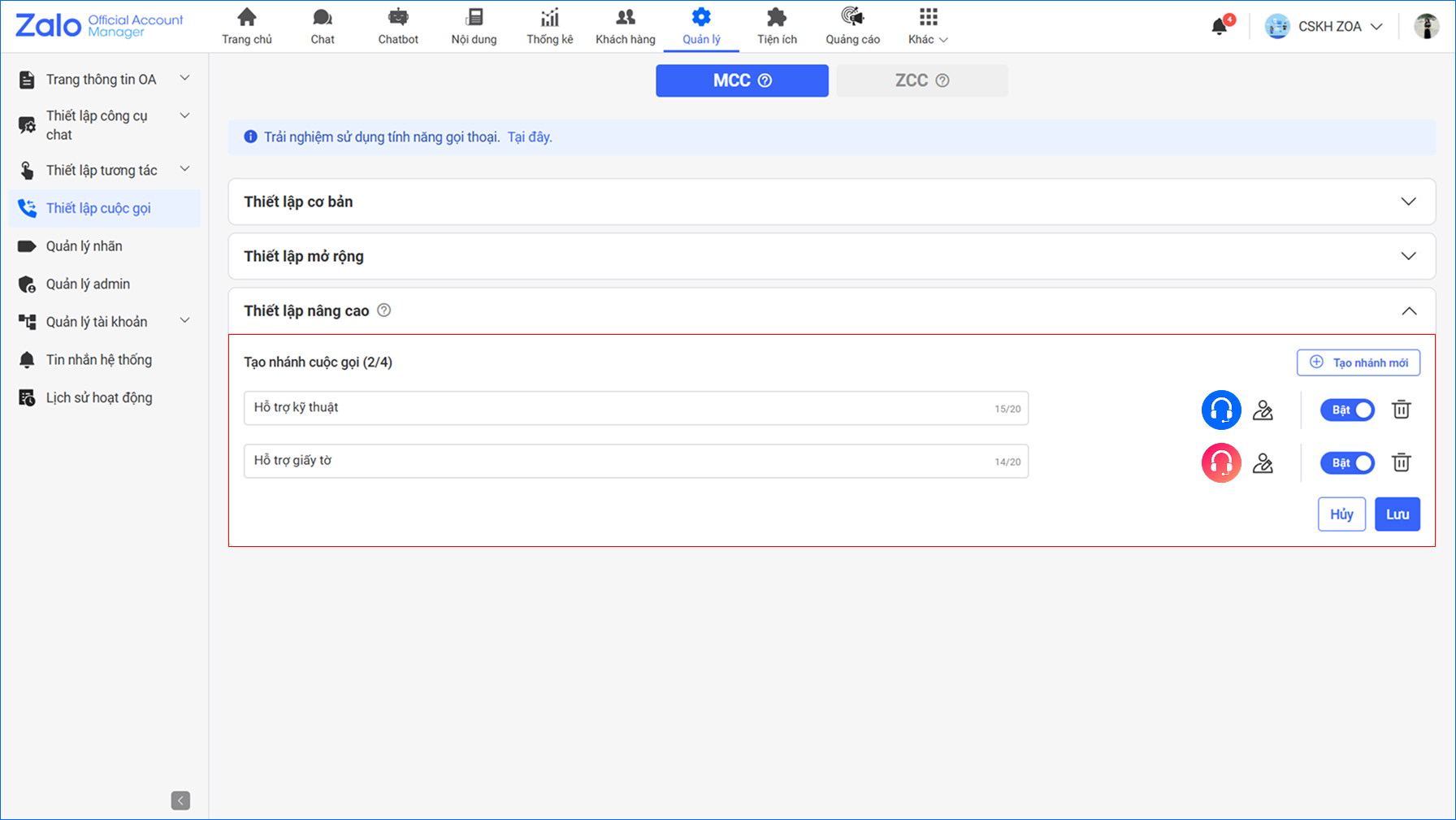 Hướng dẫn thao tác thiết lập MCC cho tính năng Gọi thoại (trên công cụ OA Manager phiên bản web)