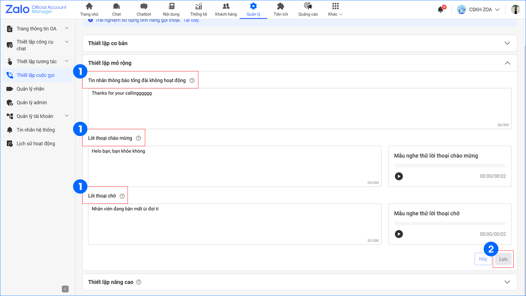 Bước 4: Tùy chỉnh Thiết lập mở rộng để tối ưu trải nghiệm của khách hàng khi Gọi thoại với OA. (Trong trường hợp Doanh nghiệp không tùy chỉnh, OA sẽ sử dụng Thiết lập mở rộng mặc định của hệ thống):