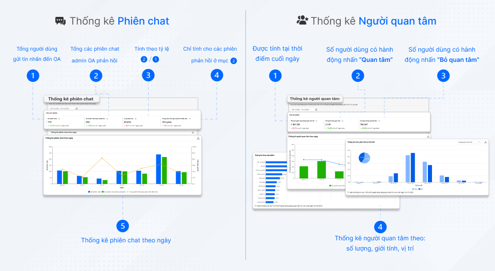 Thống kê các chỉ số về số lượng người quan tâm OA và phân tích nhân khẩu học (giới tính, độ tuổi và vị trí) dưới dạng biểu đồ. Từ đó, quản trị viên OA có thể thiết kế các nội dung Bài viết, tin Broadcast phù hợp với từng nhóm đối tượng hoặc nhóm người quan tâm trọng tâm của OA, giúp tương tác hiệu quả.