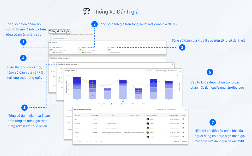 Thống kê các chỉ số đánh giá phiên chăm sóc khách hàng (CSKH) và theo dõi các kết quả đánh giá từ người dùng sau khi nhận được tin nhắn mời đánh giá do OA gửi, nhằm đo lường mức độ hài lòng và chất lượng tương tác trong các phiên CSKH.
