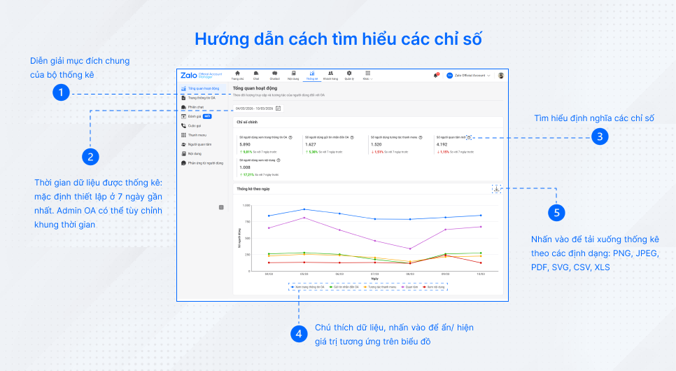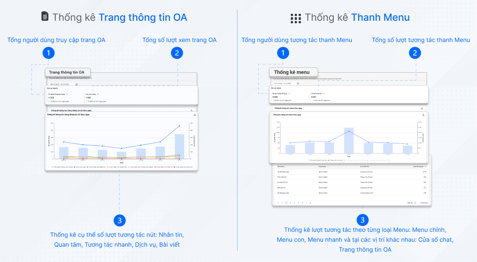 Các chỉ số về số người và số lượt truy cập trang OA cùng biểu đồ chi tiết về các hoạt động tương tác khác nhau: Nhắn tin, Quan tâm,… của người dùng giúp admin OA theo dõi lượng truy cập và thiết kế các thiết lập, nội dung bài viết phù hợp.