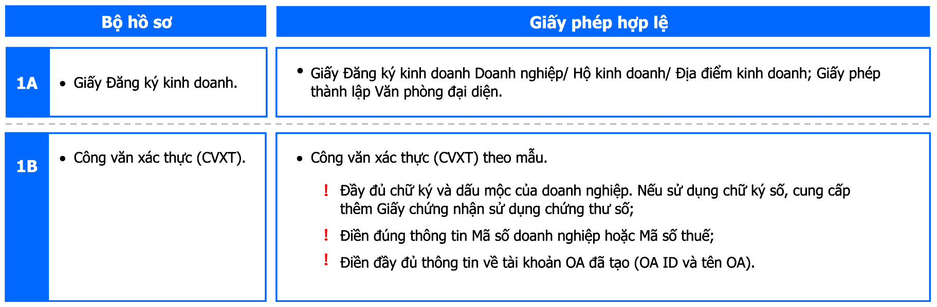 Với Bộ hồ sơ 1A: Dựa trên thông tin mà admin OA cung cấp, Người đại diện pháp luật của doanh nghiệp sẽ nhận được yêu cầu xác nhận qua Zalo để đồng ý việc tạo và xác thực tài khoản OA.