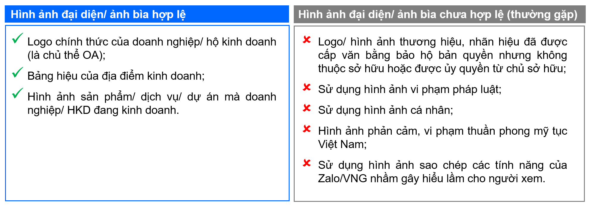 Hình ảnh (ảnh đại diện, ảnh bìa) của tài khoản Official Account Doanh nghiệp cần tuân thủ các quy định sau:
