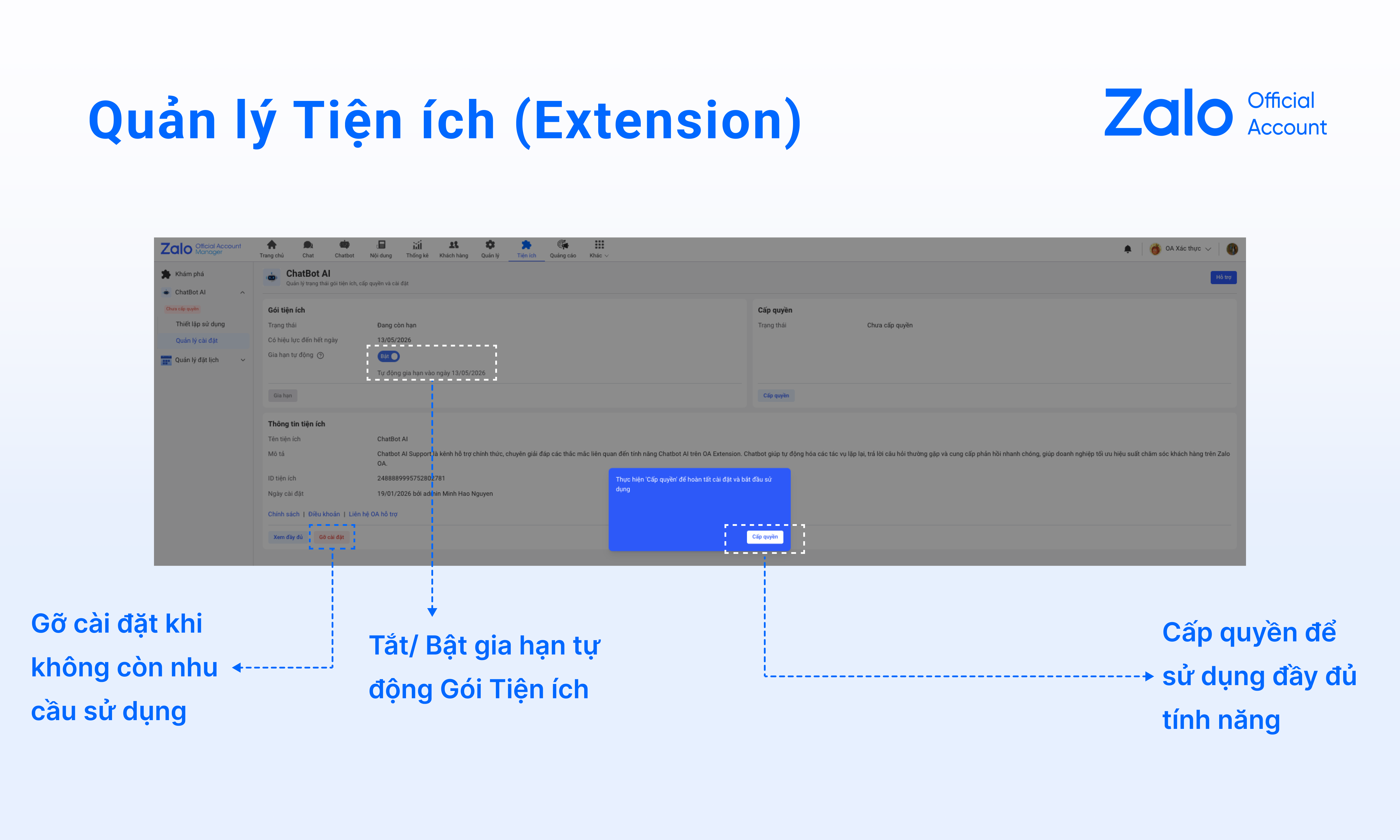 - Cập nhật quyền: OA cần cấp lại quyền để sử dụng đầy đủ chức năng khi Extension có thay đổi quyền.