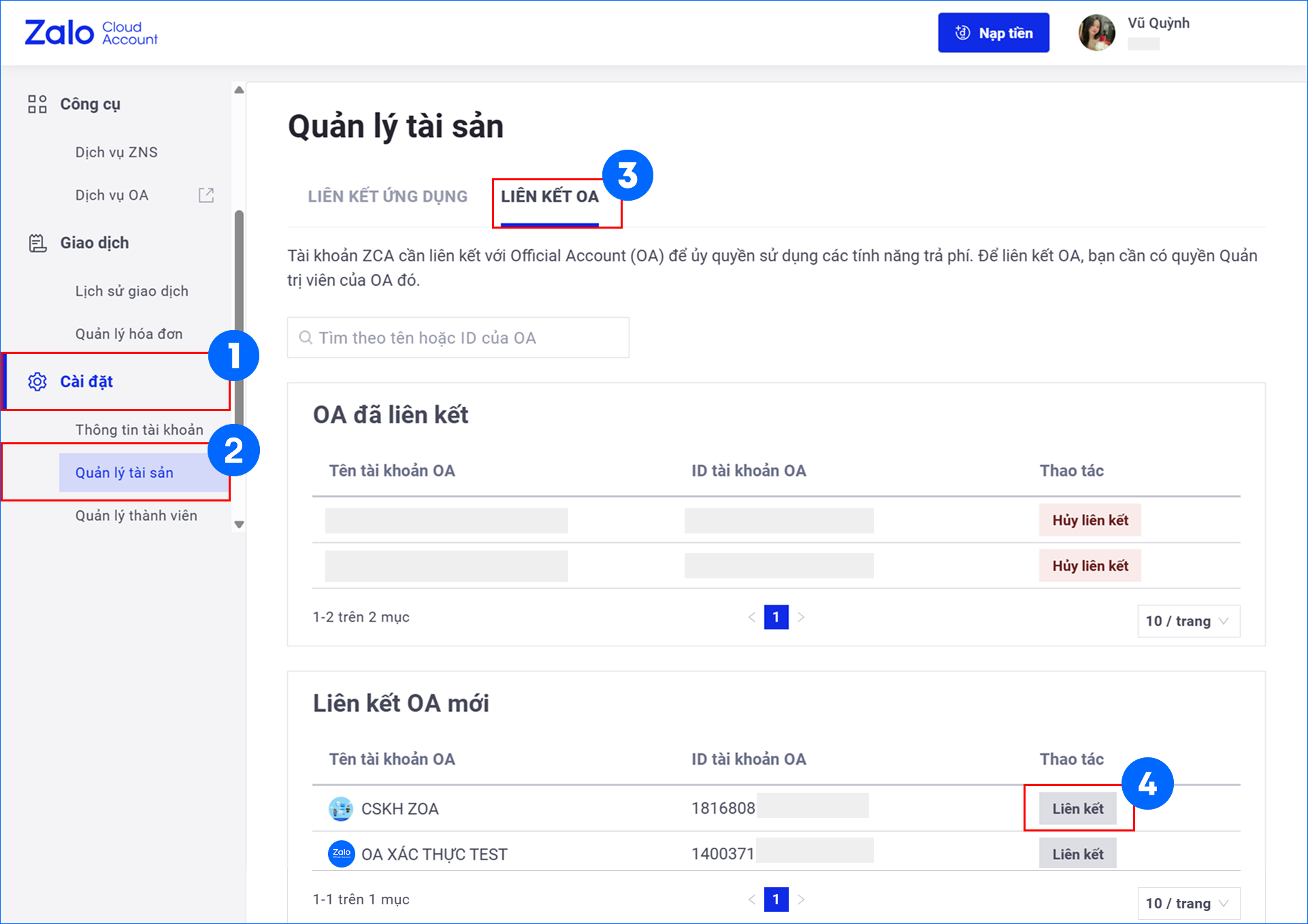 Hướng dẫn liên kết OA ID vào tài khoản ZBS Account