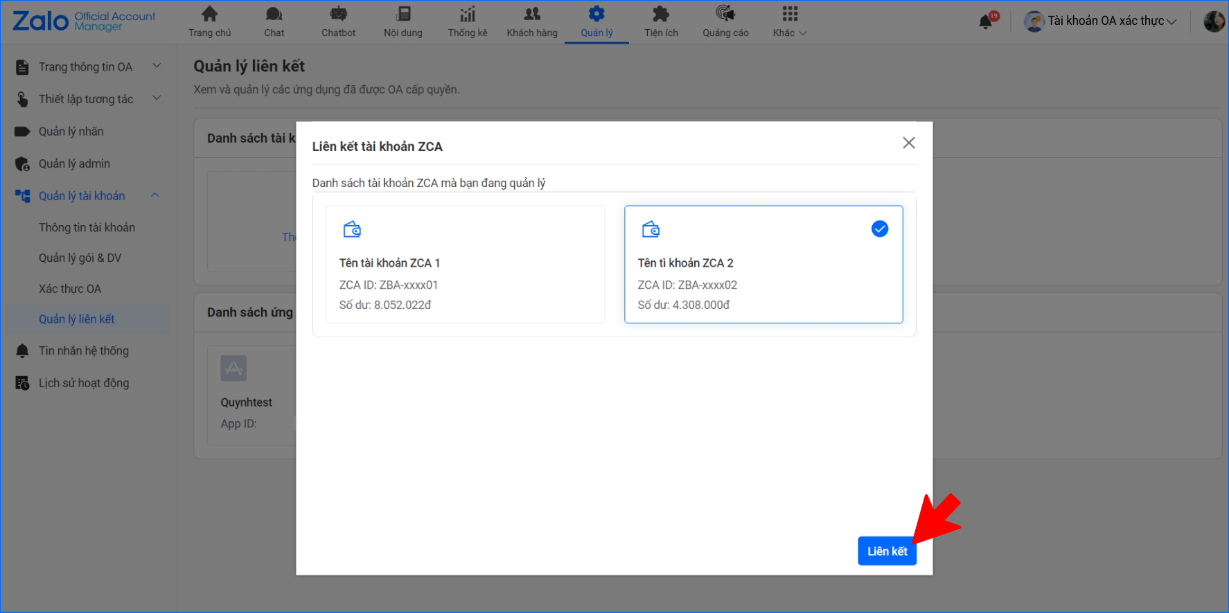 - Người dùng chọn ZBS Account muốn liên kết → Chọn Liên kết → Hệ thống thực hiện liên kết ZBS Account với OA.