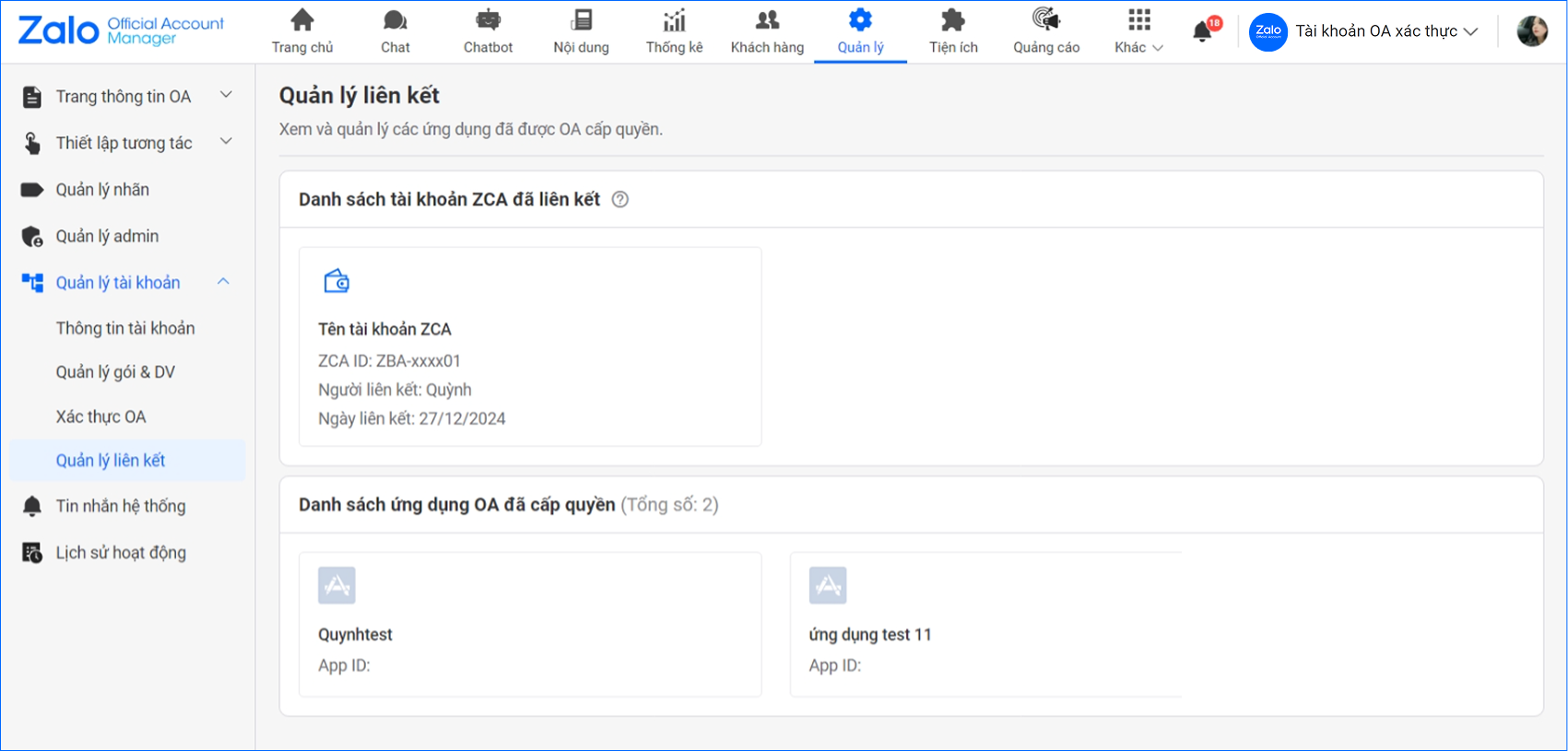 - Tại trang quản lý OA https://oa.zalo.me/manage/oa vào mục Quản lý → Chọn Quản lý tài khoản → Chọn tiếp Quản lý liên kết