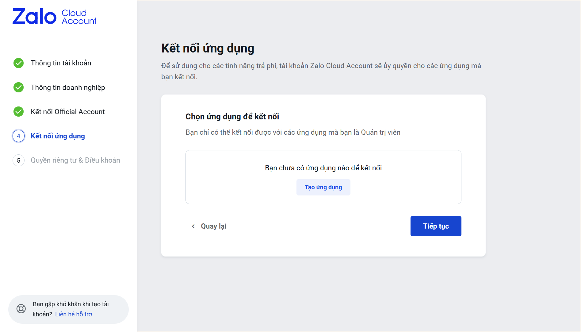 Trong trường hợp anh/chị chưa có Ứng dụng, chọn Tạo ứng dụng → hệ thống sẽ tạo 1 ứng dụng dưới tên ZBS Account của anh/chị. Anh/chị có thể bỏ qua bằng cách nhấn Tiếp tục nếu không có nhu cầu liên kết ứng dụng.