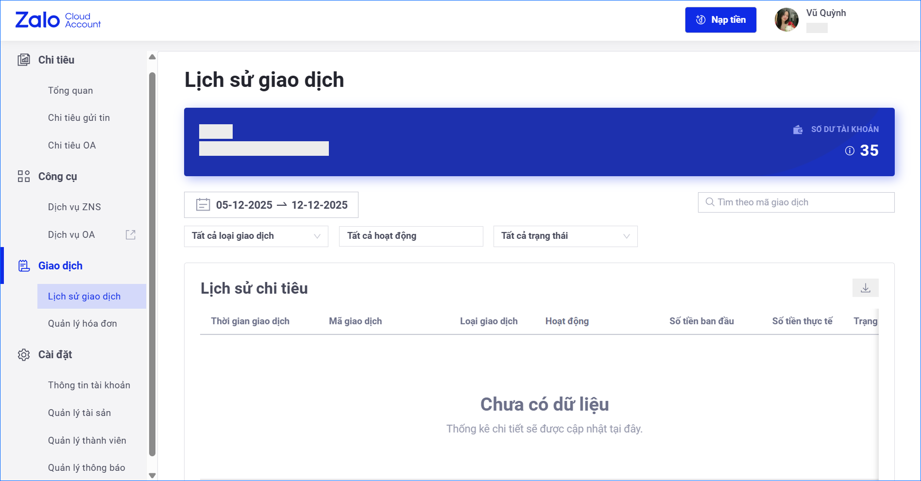 🔴 CÁCH 2: Tạo ZBS Account ngay trên trang quản lý tài khoản