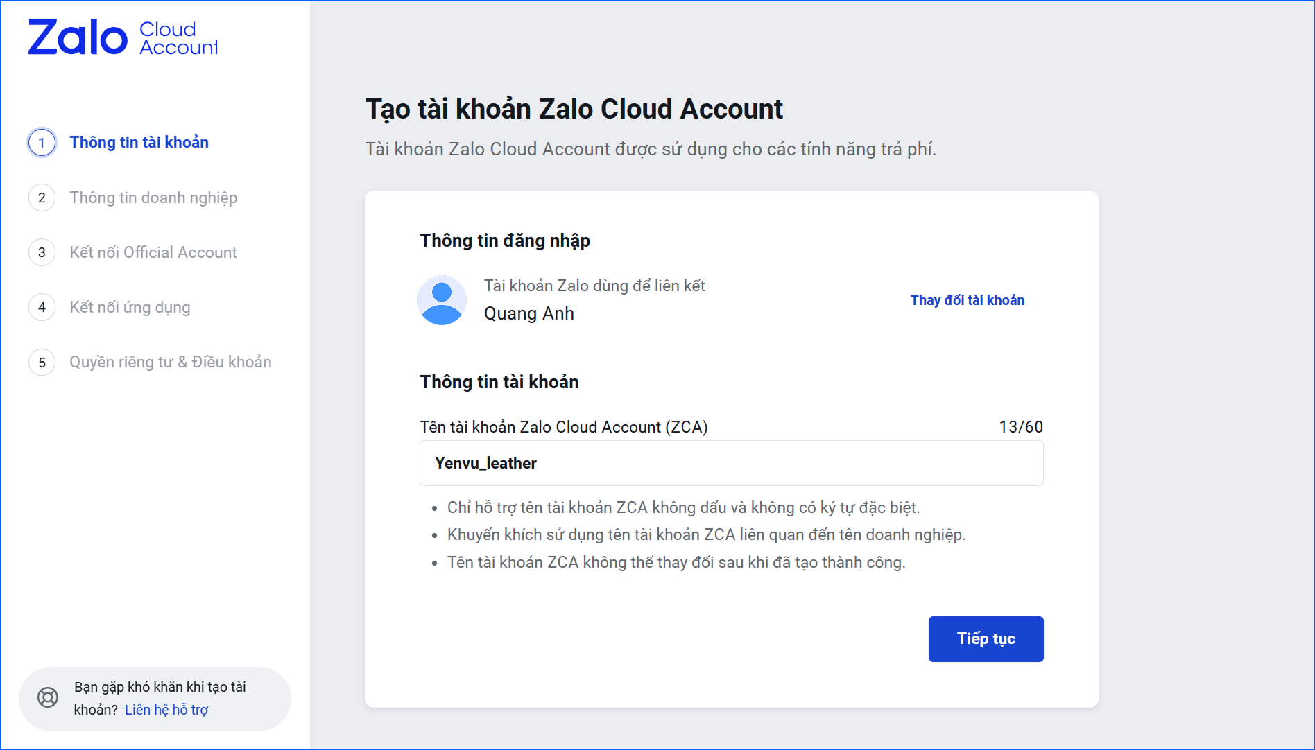 - Đăng nhập từ Zalo cá nhân và điền tên Zalo Business Solutions Account (Tên tài khoản nên là tên đăng ký kinh doanh của Doanh Nghiệp).