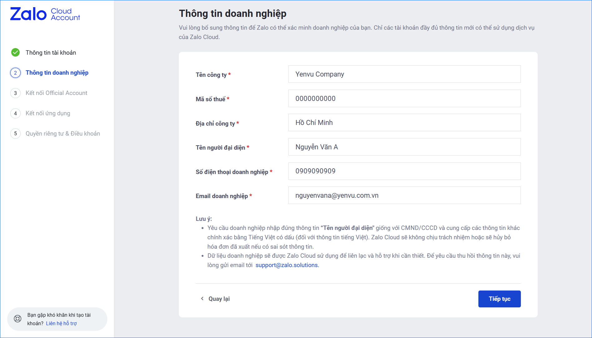⚠ Lưu ý: Anh/chị cần điền đầy đủ và chính xác thông tin doanh nghiệp.