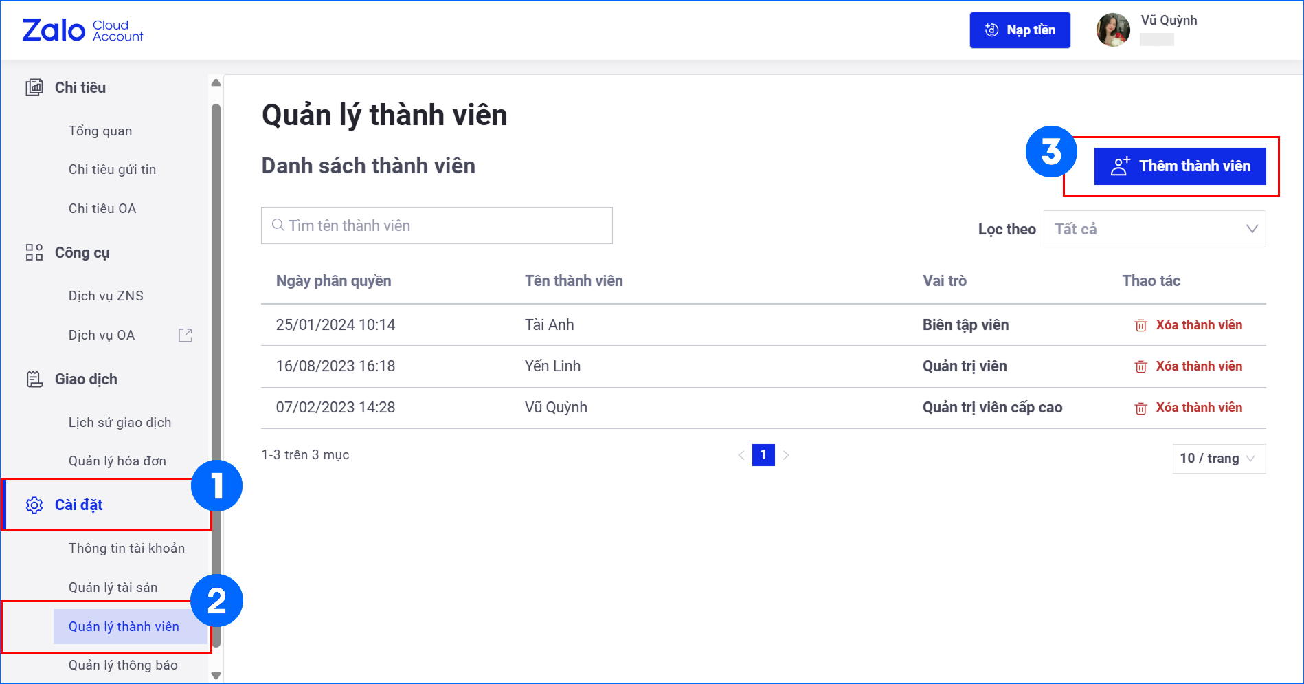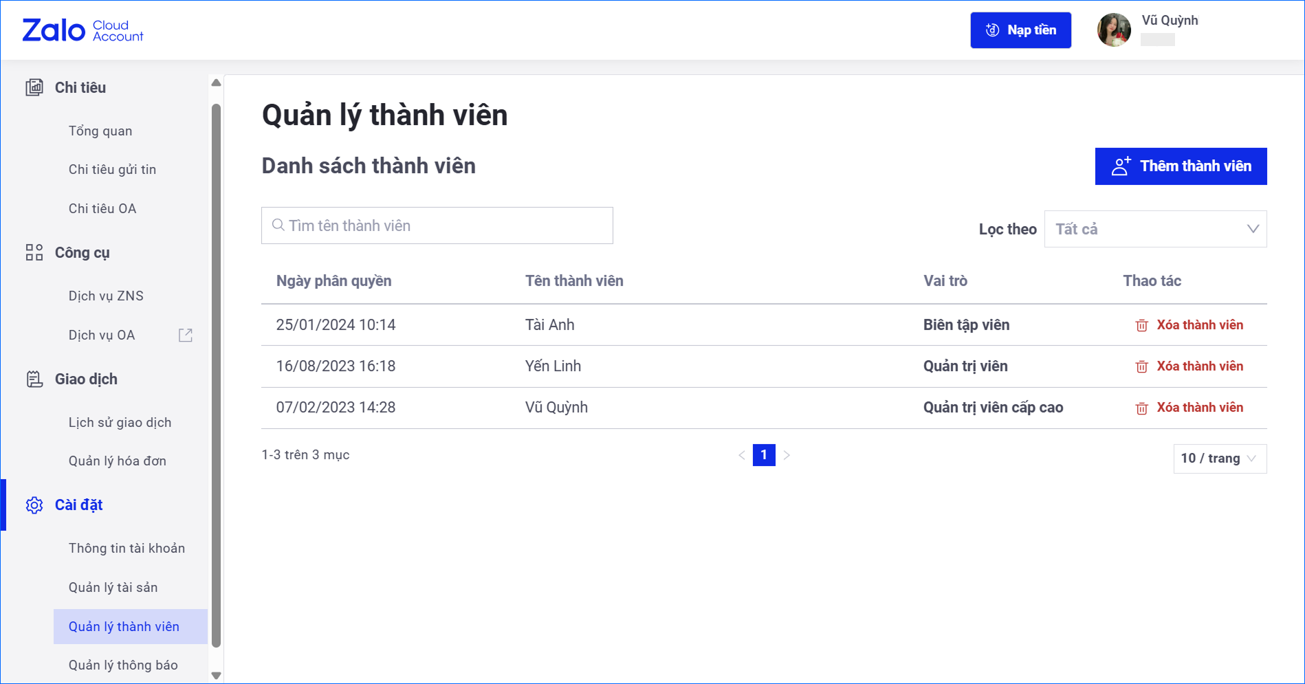 Bước 3: Xem lại và kiểm tra danh sách Admin đã được thêm vào tại mục Cài đặt → Quản lý thành viên