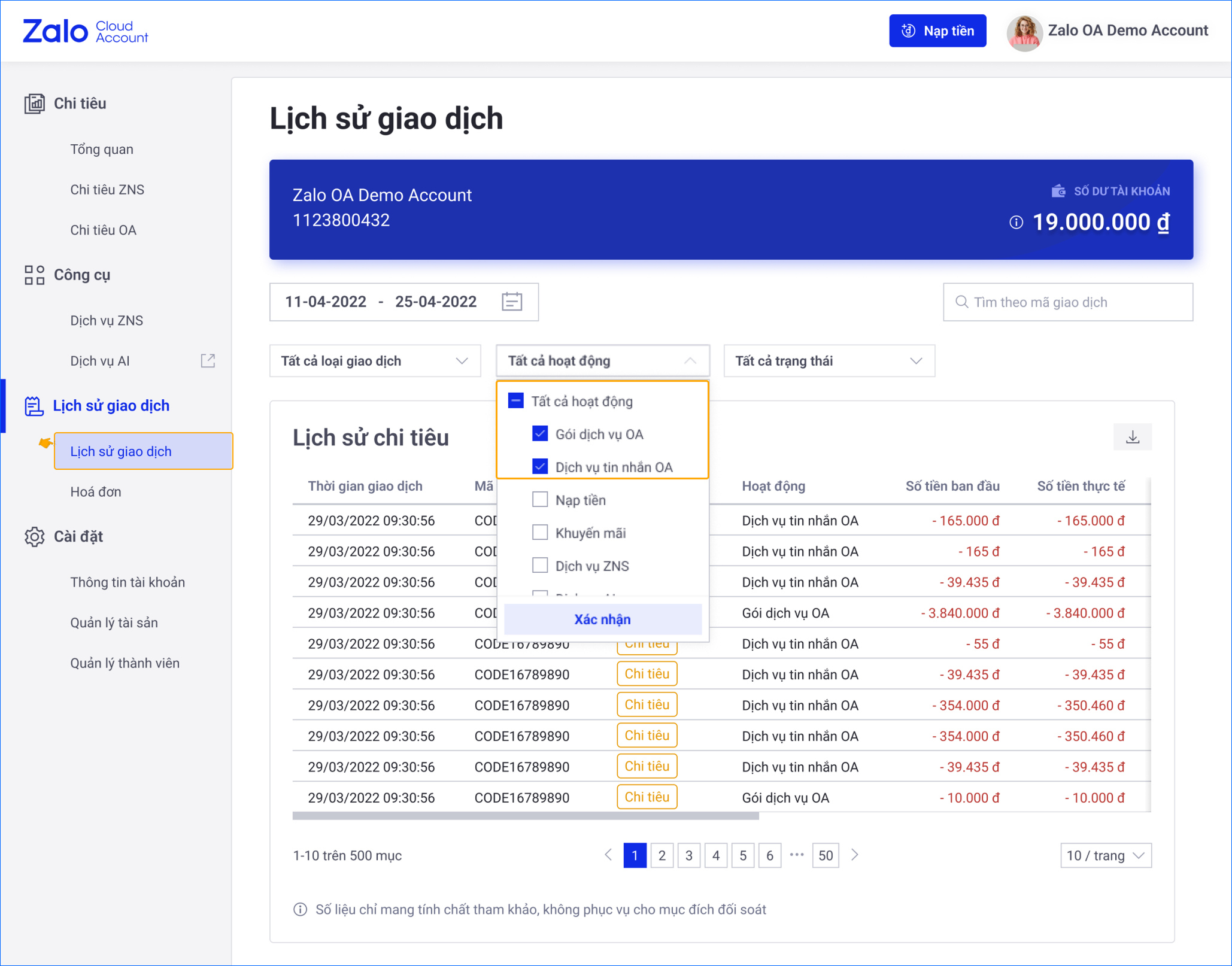 Ảnh 2: Trang Chi tiêu OA: Lịch sử chi tiêu chi tiết