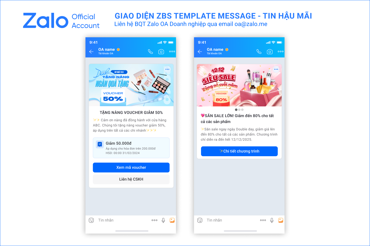 ZBS Template Message là giải pháp tin nhắn cho Doanh nghiệp theo mẫu (template). ZBS Template Message có 2 loại chính: Tin Giao dịch và Tin Hậu mãi