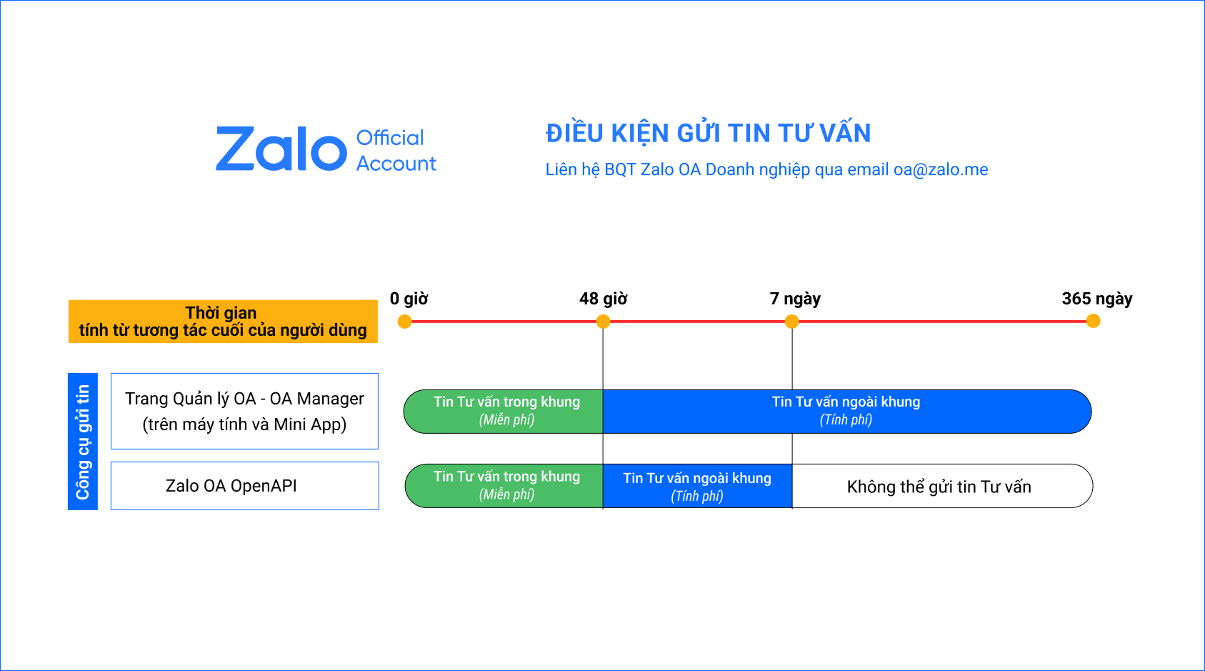 - Công cụ OA OpenAPI có thể gửi tin Tư vấn đến người dùng trong vòng 07 ngày kể từ tương tác cuối của người dùng.