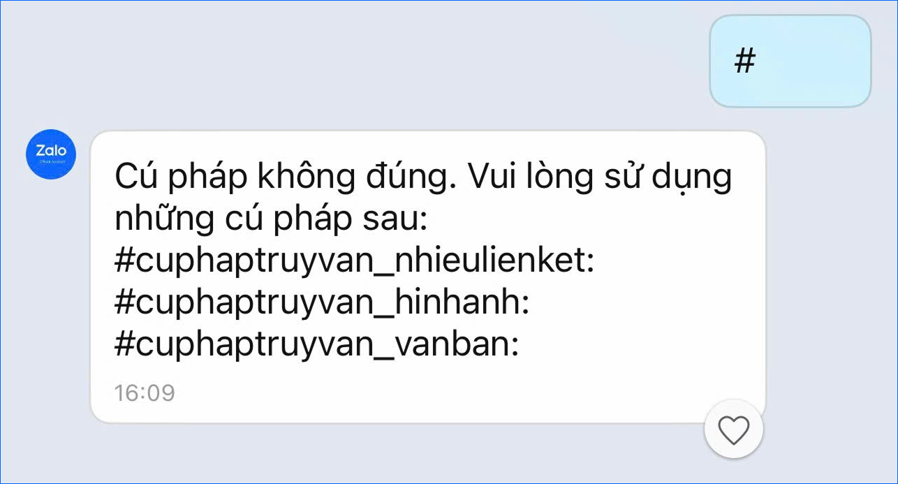 • Hệ thống sẽ tự động nhận diện người dùng gọi truy vấn khi tin gửi đến OA có ký tự bắt đầu là #. Trong trường hợp cú pháp truy vấn sai, hệ thống sẽ báo lỗi và liệt kê danh sách các truy vấn của OA như ví dụ sau: