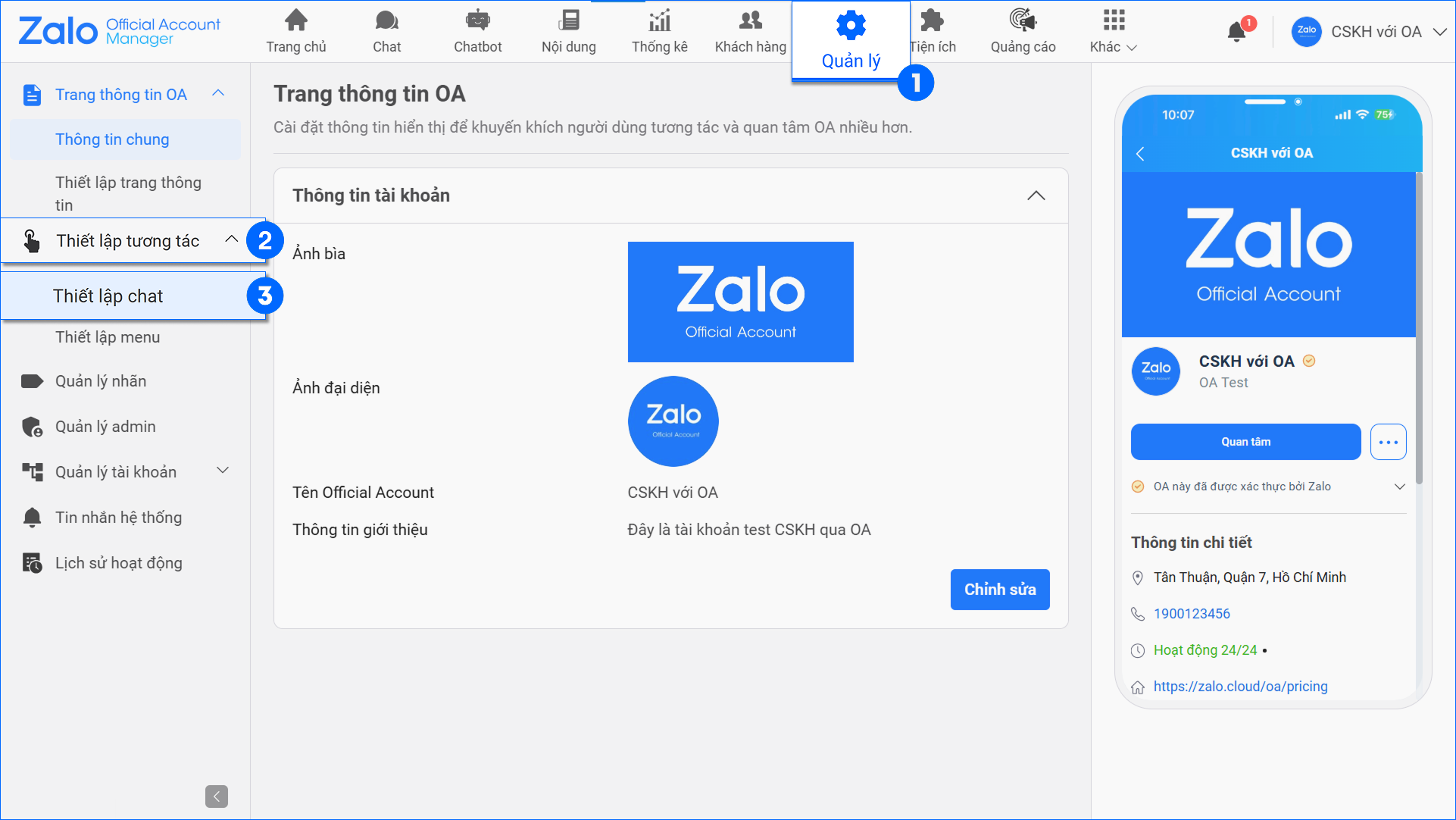 Truy cập trang Quản lý ➞  Thiết lập tương tác ➞ Thiết lập chat hoặc truy cập trực tiếp vào đường dẫn: https://oa.zalo.me/manage/setting