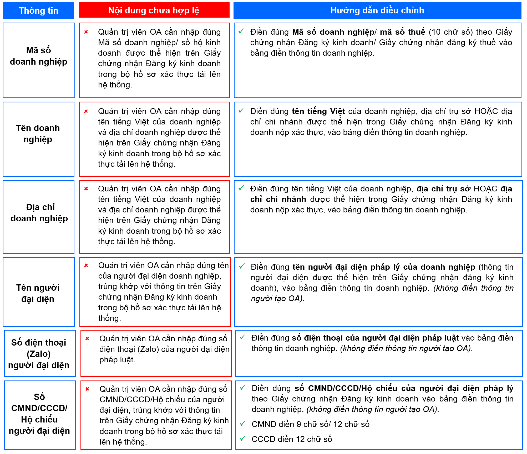 Nếu quản trị viên OA nhận được lý do từ chối có nội dung [cần nhập đúng…]. Quản trị viên OA cần phải đọc kỹ thông tin yêu cầu điều chỉnh (ví dụ: mã số doanh nghiệp, tên doanh nghiệp, địa chỉ doanh nghiệp, tên người đại diện, số CMND/CCCD/Hộ chiếu người đại diện), để tra cứu hướng dẫn điều chỉnh tương ứng dưới đây:
