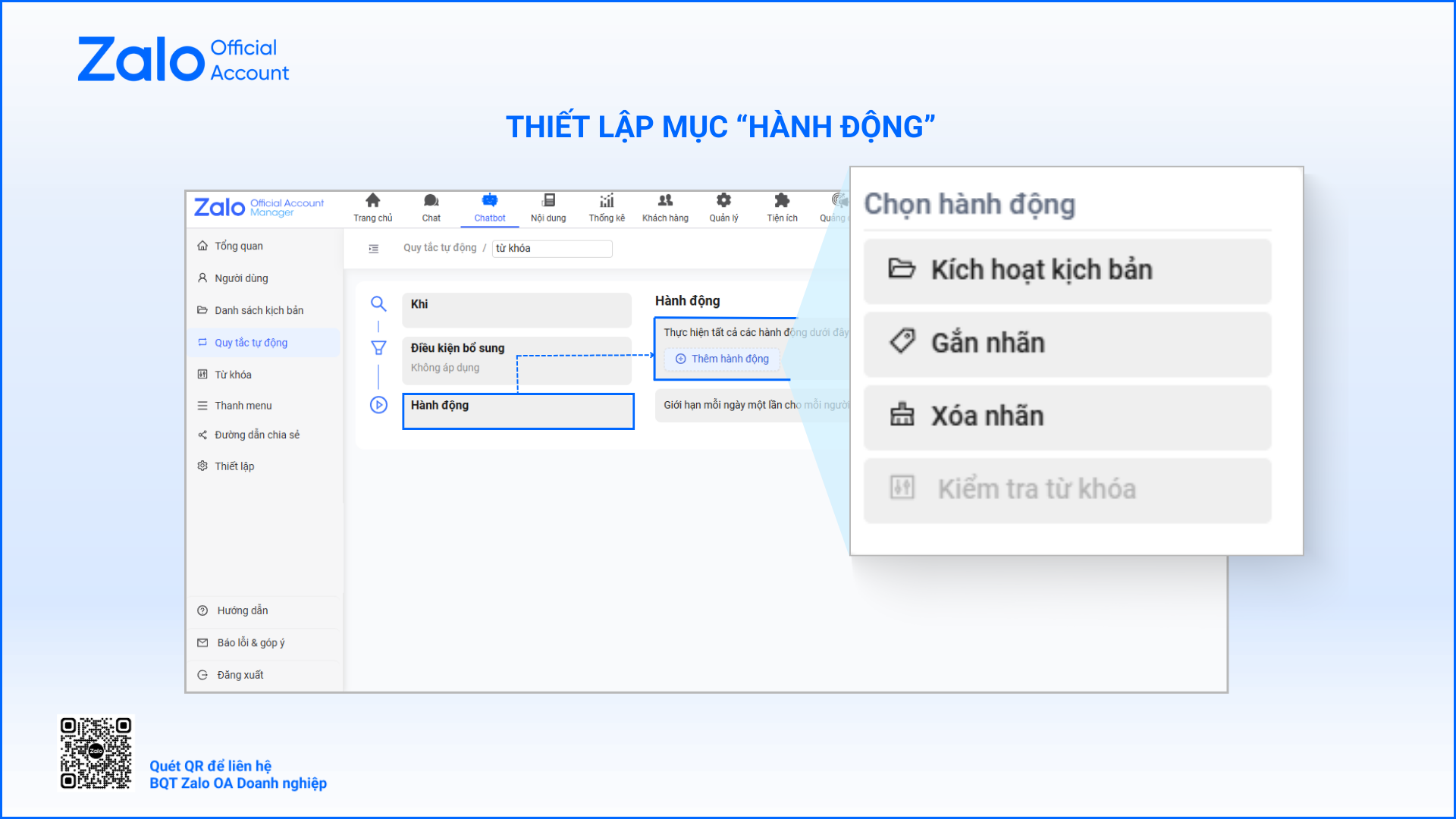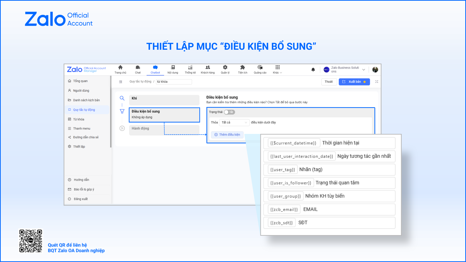 Anh/chị có thể xem chi tiết các hướng dẫn về Zalo Chatbot tại đây. Việc kết hợp Zalo Chatbot cùng các tính năng khác trên Zalo OA sẽ giúp doanh nghiệp xây dựng quy trình chăm sóc khách hàng tự động, đồng bộ và hiệu quả hơn. Để tối ưu trải nghiệm và gia tăng hiệu quả tương tác, anh/chị có thể tham khảo thêm các hướng dẫn liên quan và theo dõi các bài viết khác tại mục Thư viện.