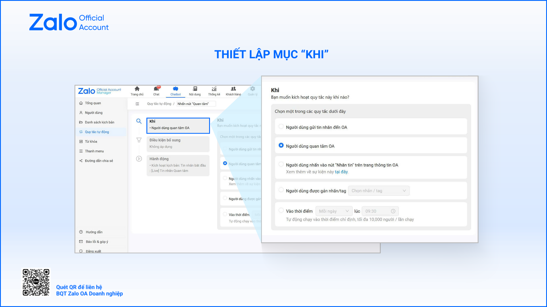 Thiết lập quy tắc ở mục "Khi"➞ Lựa chọn theo các loại tương tác của khách hàng như: Người dùng gửi tin nhắn đến OA, quan tâm OA, nhấn nút "Nhắn tin" trên trang OA, được gắn nhãn/tag hoặc vào thời điểm cụ thể.