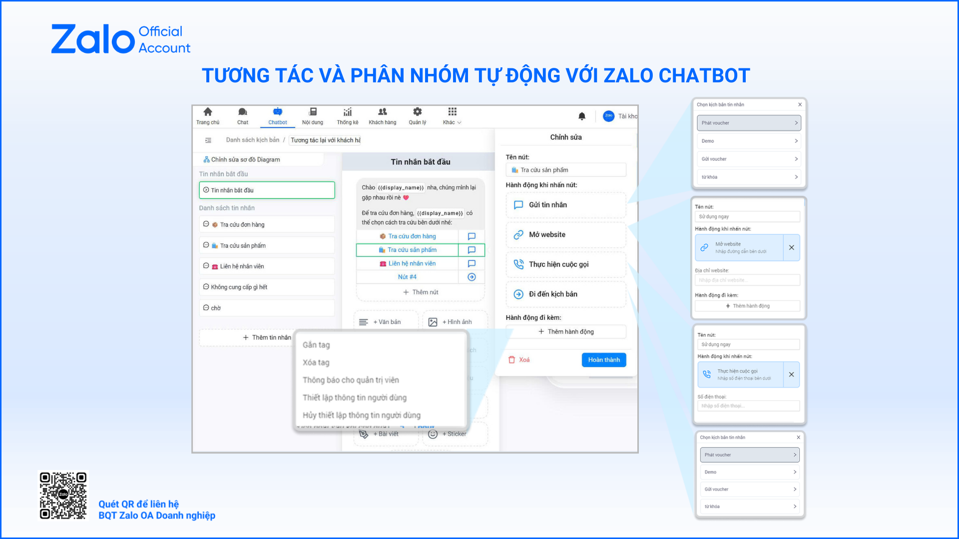 Tính năng này phù hợp để xây dựng các kịch bản như đặt lịch hẹn, đặt bàn, đăng ký khóa học, gửi mã voucher…, giúp phản hồi nhanh cho khách hàng và tiết kiệm nguồn lực nhân viên.