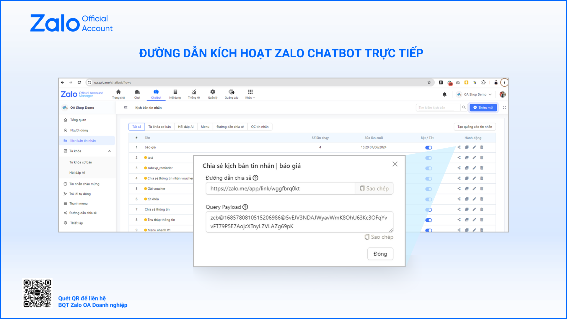 Truy cập vào trình quản lý OA Manager oa.zalo.me>Chatbot>Danh sách kịch bản> tại mục Hành động & chọn Chia sẻ kịch bản sau đó copy đường dẫn chia sẻ.