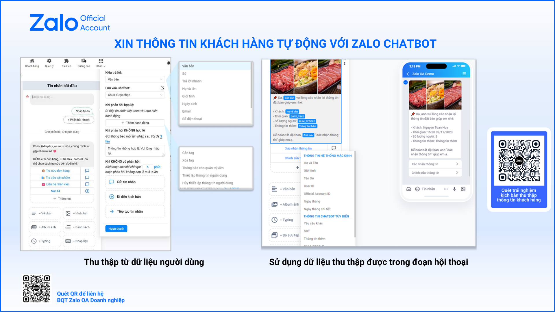 Trong các tình huống cần thu thập thông tin khách hàng, doanh nghiệp có thể sử dụng chatbot để tự động hóa toàn bộ quy trình. Thông qua tính năng nhập liệu trong kịch bản, khách hàng có thể cung cấp thông tin trực tiếp khi tương tác với Zalo OA. Các dữ liệu này được chatbot sử dụng để cá nhân hóa nội dung chăm sóc và nâng cao trải nghiệm khách hàng.
